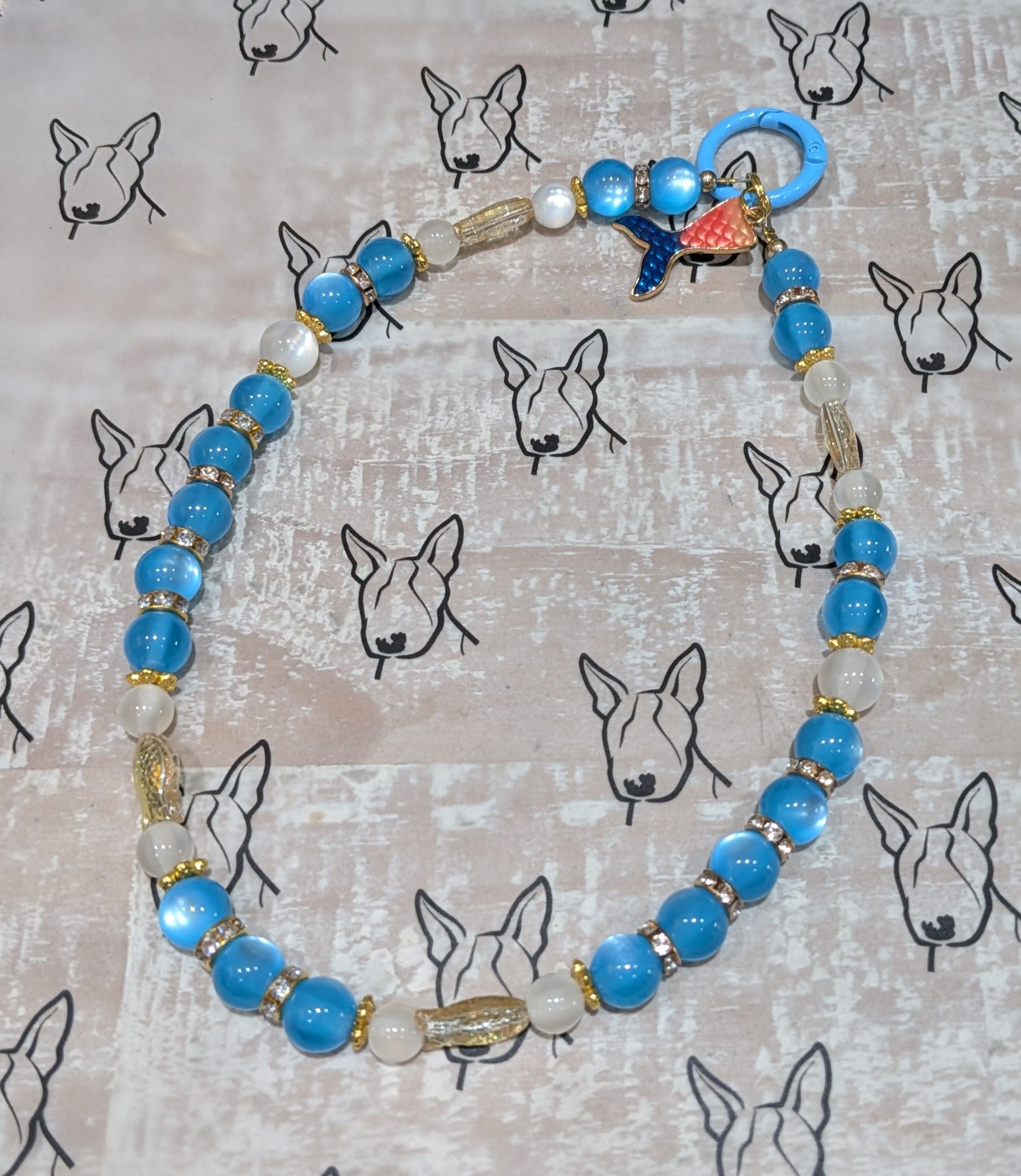 This piece adds a pop of personality and serious practicality to any phone or bag, made with blue resin cats-eye beads and golden fish glass accent beads, with a cute mermaid tail charm.