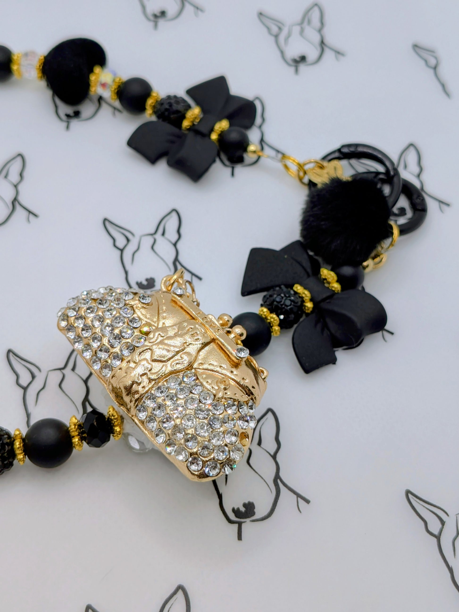This piece adds a pop of personality and serious practicality to any phone or bag, made with chic matt black glass beads, bling glass beads, gold spacers and a sparkling handbag charm.